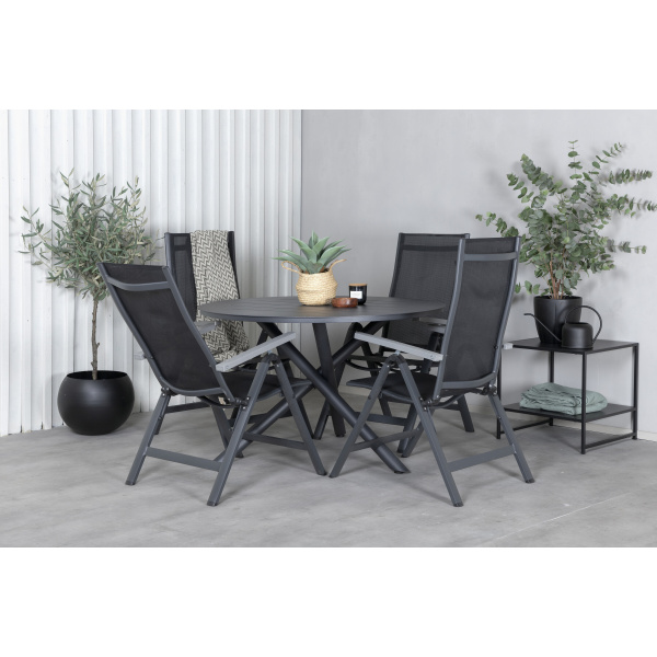 Stilrent, slitstarkt och smart! Här erbjuds du det bästa av alla världar när du kombinerar vårt runda matbord Alam i svart kulör med bekväma, justerbara stolar från serien Albany. Matbordet har en klassisk och tidlös design och i stolarna sitter du och dina gäster bekvämt i flera timmar. Skapa ett modernt blickfång på uteplatsen i sommar!