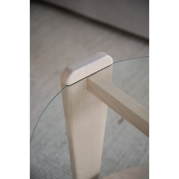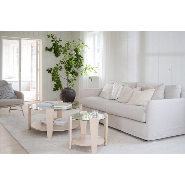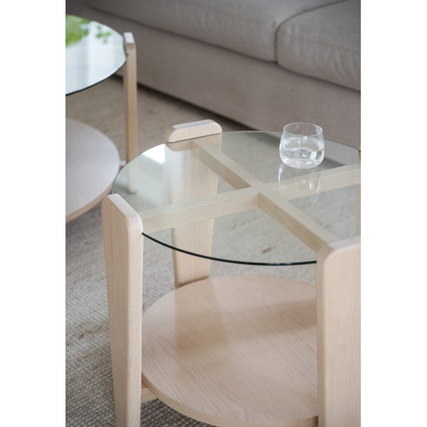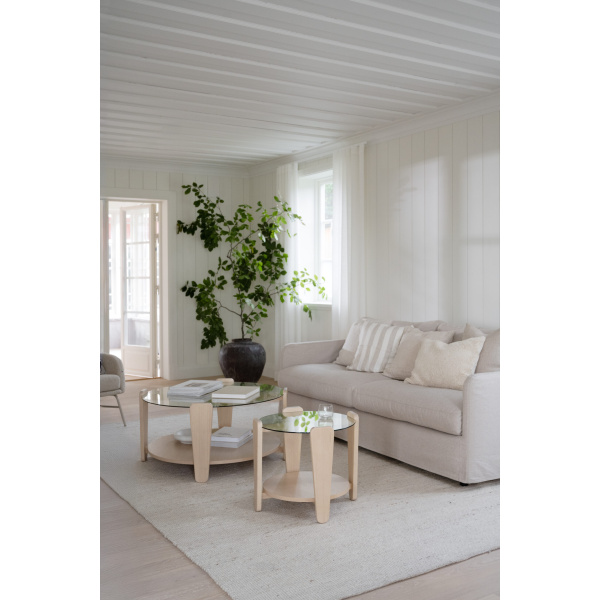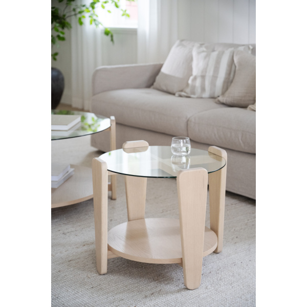 Arran soffbord Ø52 är ett stilrent soffbord kombinerat med en modern skandinavisk design. Glasskivan som möter den vitpigmenterade eken ger en snygg kontrast som inger elegans. Soffbordets rundhet skapar en mjuk känsla som passar till de flesta soffor. Arran soffbord finns i två olika storlekar. Det som är minst kan användas som sidobord eller placera det separat eller tillsammans det större Arran soffbordet så blir det en känsla av satsbord. Finns även i brun ek.