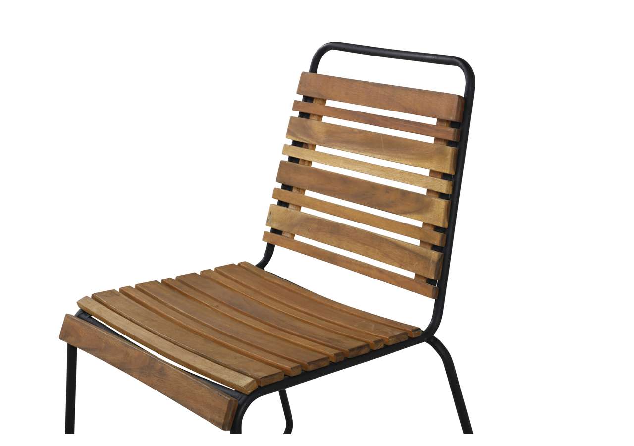 Bois, våra läckra trästolar i akacia är en riktig designikon till uteplatsen! De smala svarta benen ger ett luftigt och stilrent intryck. Stilren matstol med både ryggstöd och sits i träfärg med ben i svart, vilket blir en pampig detalj. Stolen blir garanterat ett blickfång på altanen tack vare sin moderiktiga konstruktion. Stolen är stapelbar.