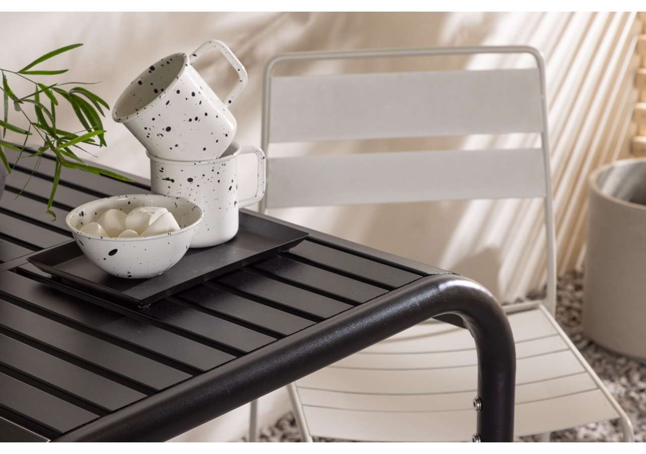 Stilrent och minimalistiskt – perfekt för den lilla balkongen eller uteplatsen! Bordet från serien Borneo har följsamma former och en tidlös Skandinavisk design. Bordsskivan är ribbad och böljar ner längs kanterna vid benen. Genomgående tillverkat i svart aluminium vilket ger dig ett slitstarkt bord som är enkelt att flytta omkring på. Här tillsammans med våra smakfulla matstolar från serien Lina. Den nätta stolen är i beige stål och matchar bordet utmärkt. Njut av soliga fikastunder i sommar!