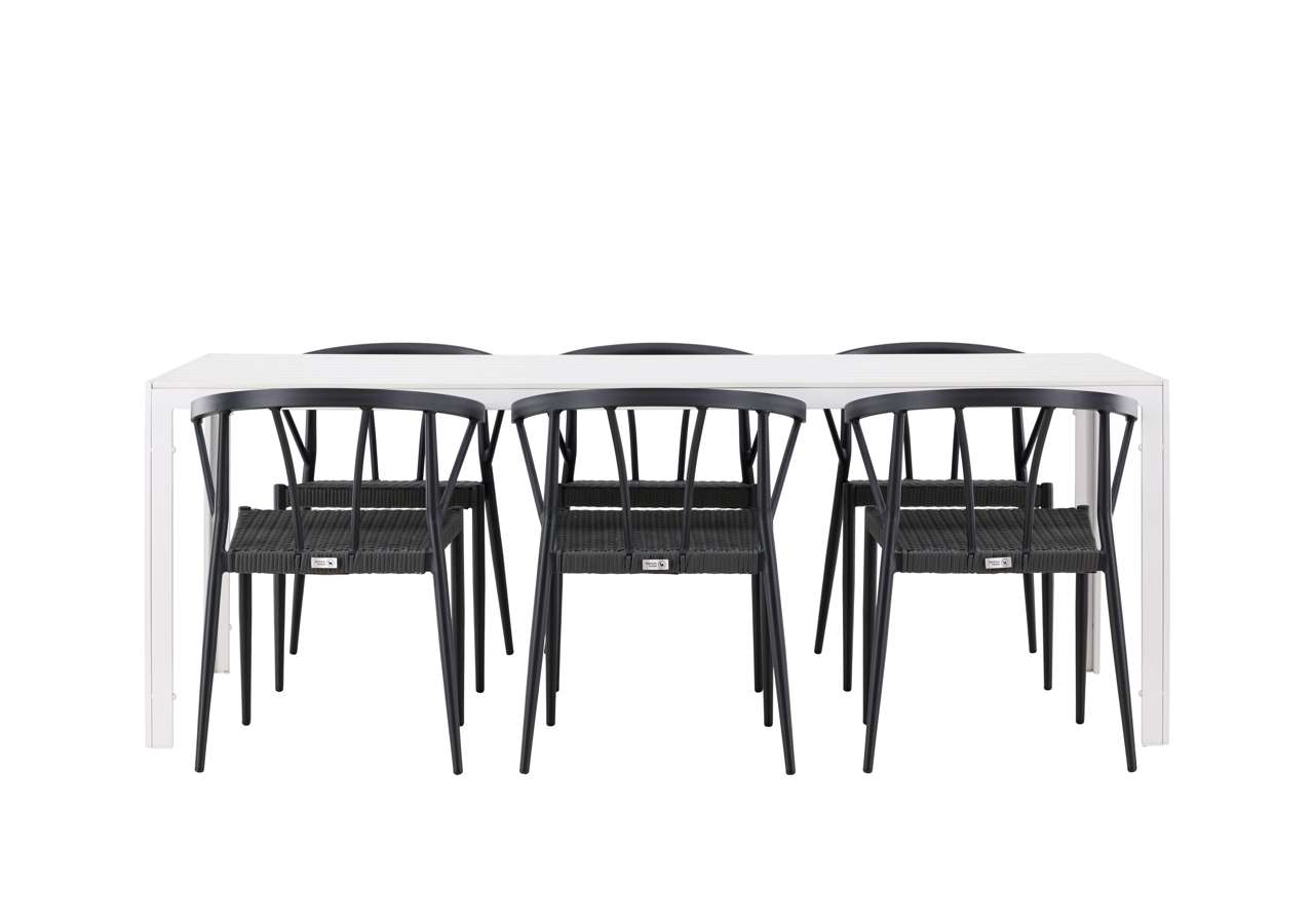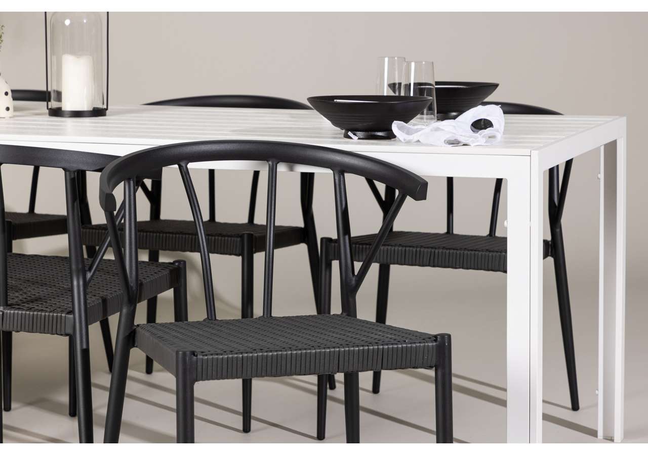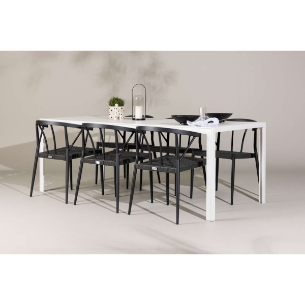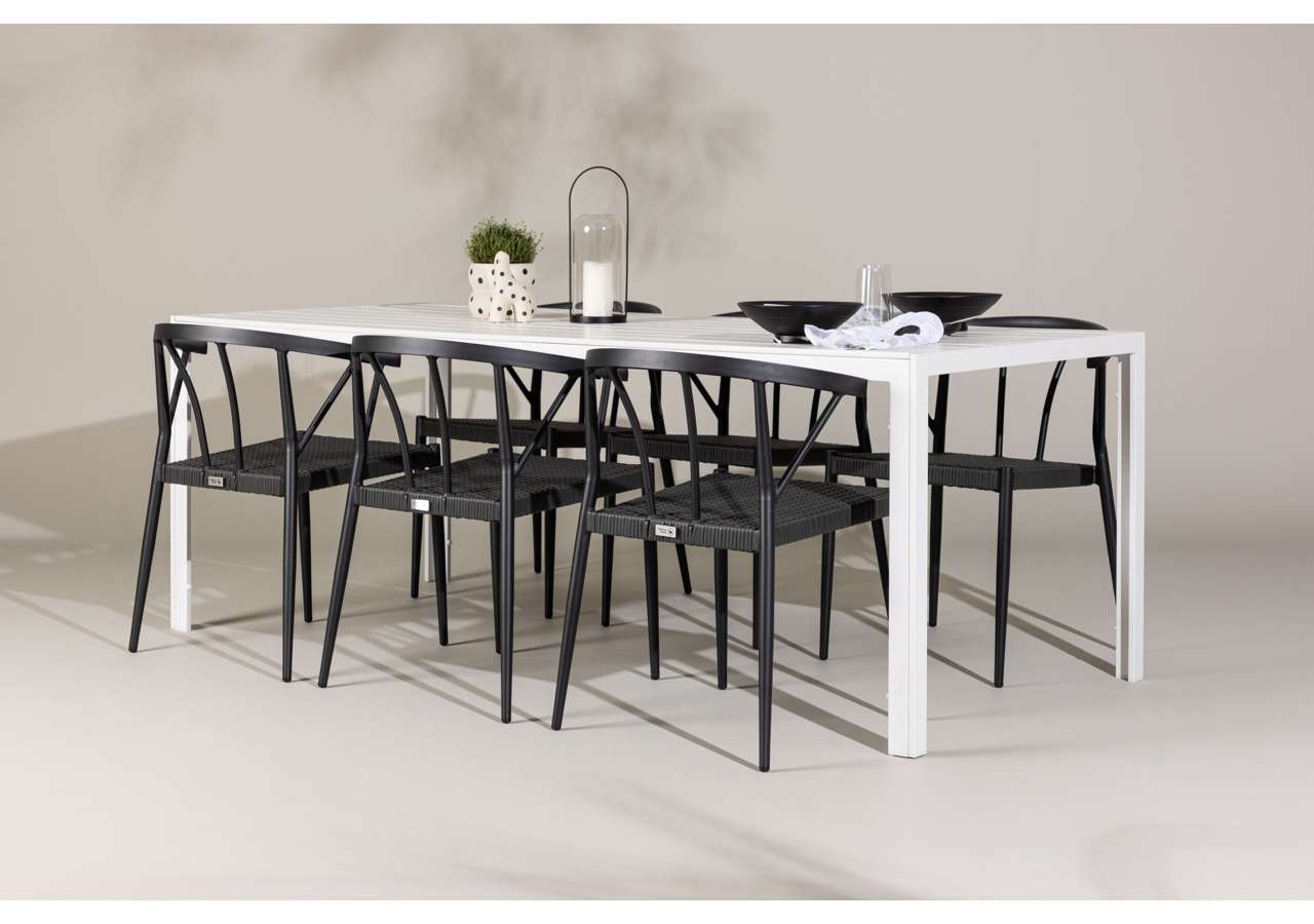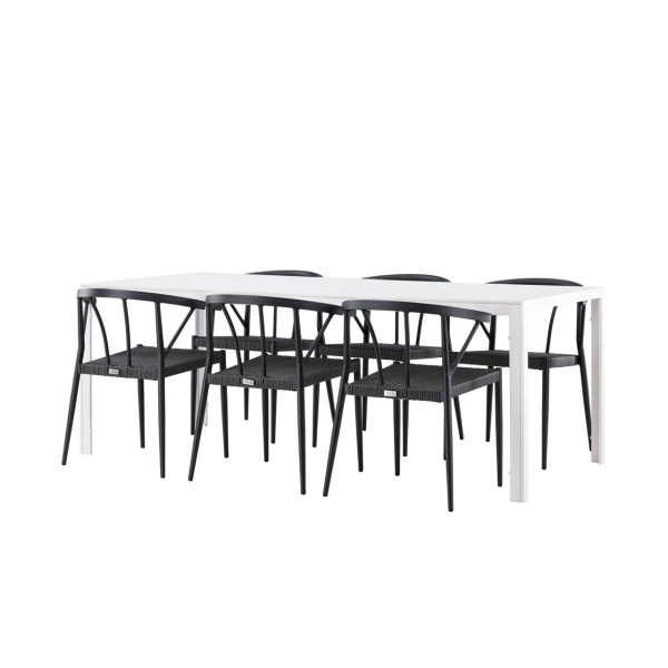 This dining set is ideal for outdoor use and serves as a style statement and interior detail with its impressive presence. With six chairs included, this set is complete to create memorable moments and elevate your outdoor space to a new level of style and comfort.