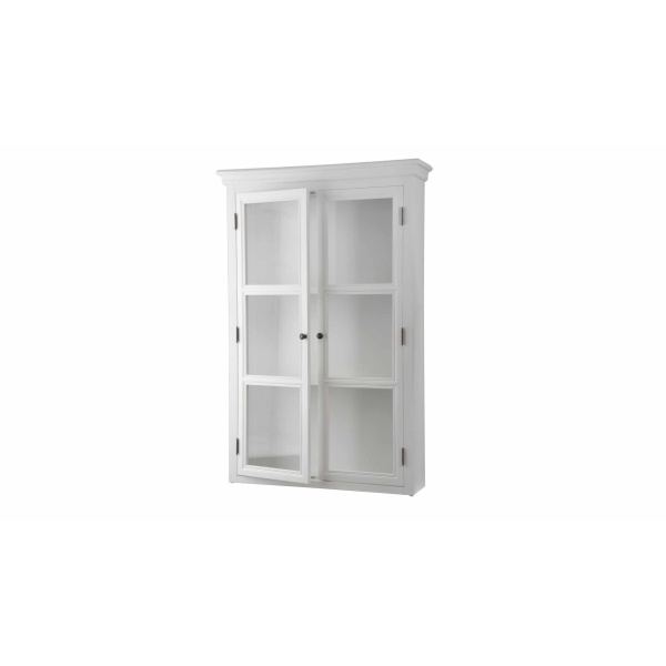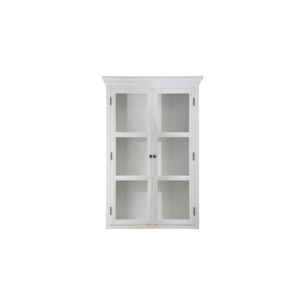 Bristol väggskåp i skärgårdsstil är en klassisk förvaringslösning som passar perfekt för dem som söker ett stilrent och praktiskt väggskåp. Skåpets matta vita antikbetsade trä ger en vacker, sliten vintagekänsla och skåpet levereras helt färdigmonterat. Väggskåpet har två vitrindörrar i glas och vita detaljer, med tre sektioner i vitlackat utförande på insidan.