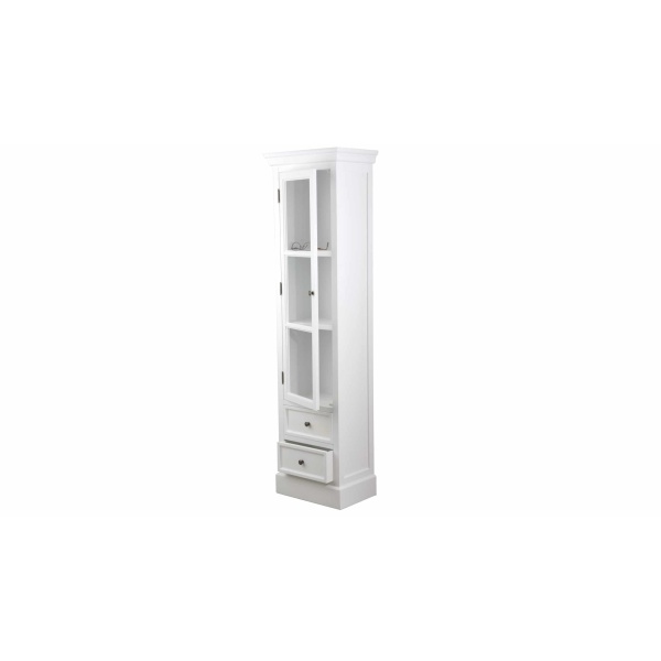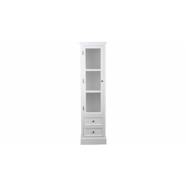 Bristol är ett elegant och klassiskt vitrinskåp från NFG. Det är tillverkat med en matt vit antikbetsad trästomme som ger en sliten och rustik vintagelook. Skåpet levereras färdigmonterat och har två mindre lådor i botten för praktisk förvaring av mindre föremål. Den eleganta vitrindörren är gjord i glas med vita detaljer och ger skåpet en tidlös känsla. Invändigt har skåpet tre sektioner som är vitlackade för att öka ljusreflektionen och skapa en stilren finish.