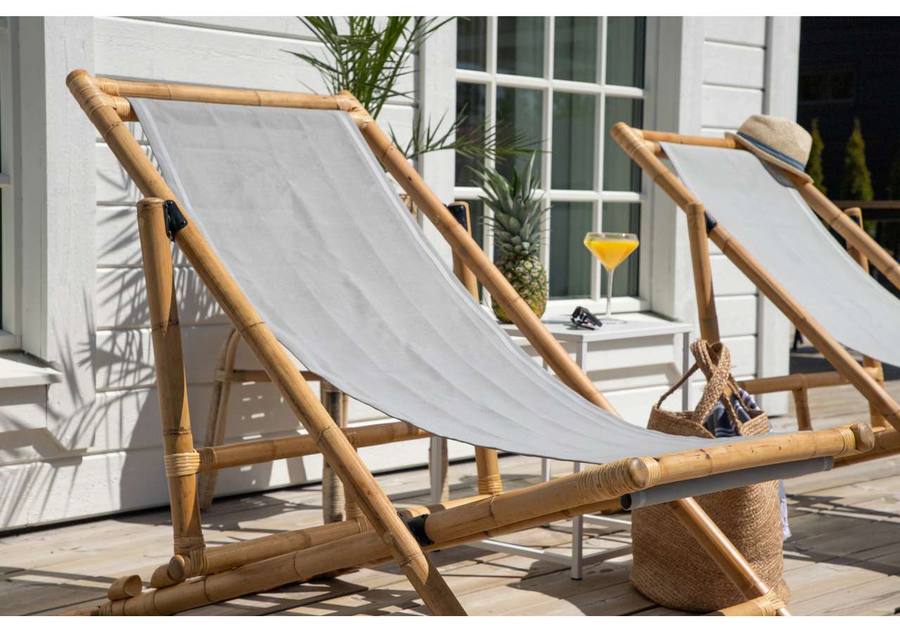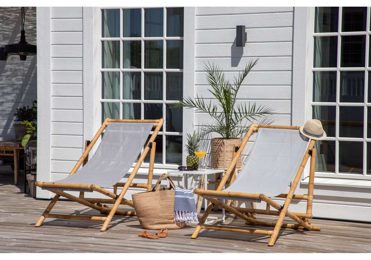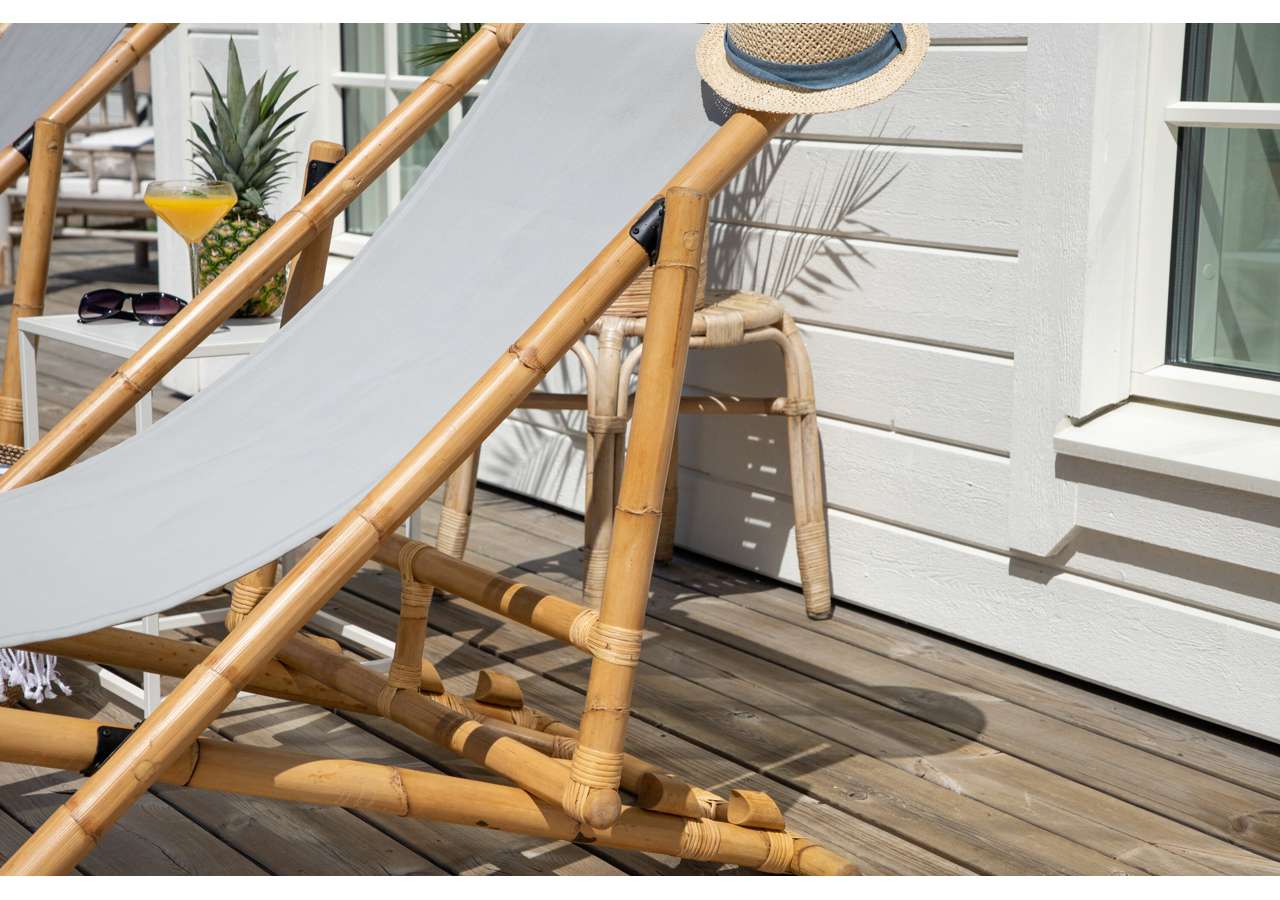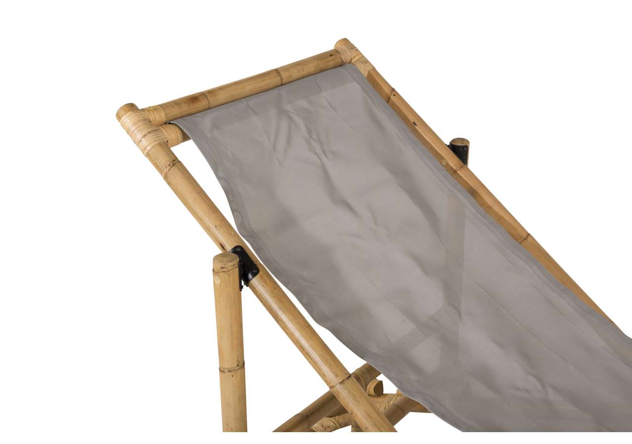 Skapa en härlig oas hemma på uteplatsen med en modern solstol i bambu från serien Cane. Denna bekväma solstolen skapar en tropisk känsla med sin genomtänka helhetsdesign. Den grå sitsen är av polyestertyg. Stommen är tillverkad av naturfärgad bambu och det naturliga materialet ger varje enskild möbel en unik karaktär. En snygg och smart solstol helt enkelt som är lätt att flytta runt och som drar blickarna till sig. Skapa semesterkänsla hemma och njut av sommardagarna.