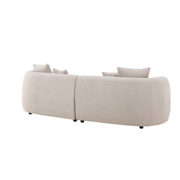 Det beige bouclématerialet ger soffan en unik textur och mjukhet som både ser och känns exklusiv. Denna tidlösa nyans smälter smidigt in i olika inredningsstilar, från minimalistisk till skandinavisk eller mer eklektisk, och tillför samtidigt en känsla av värme och stil till rummet.