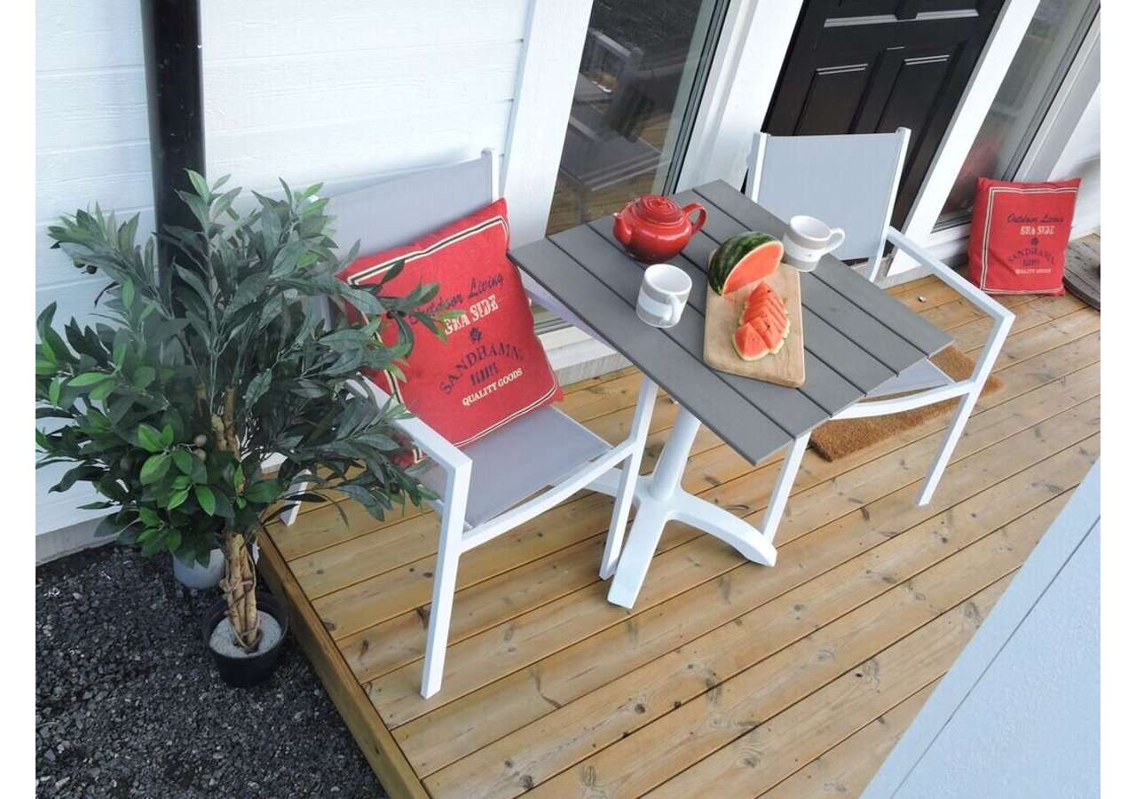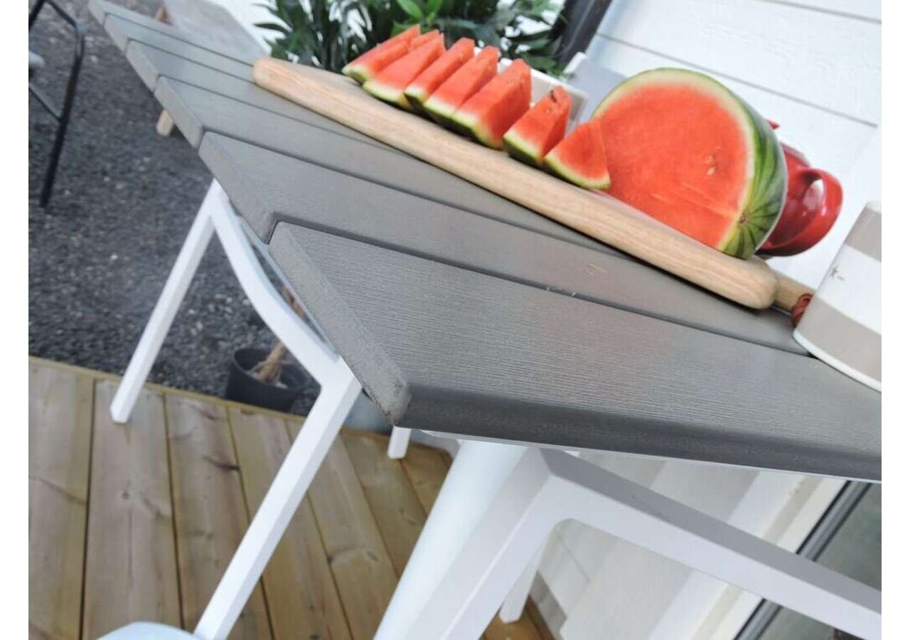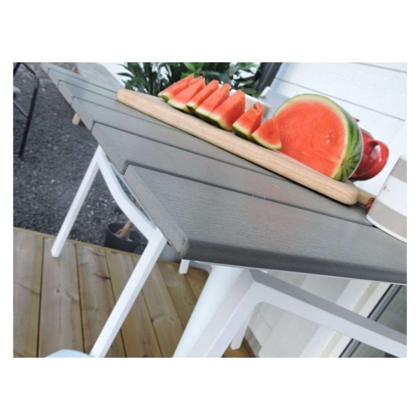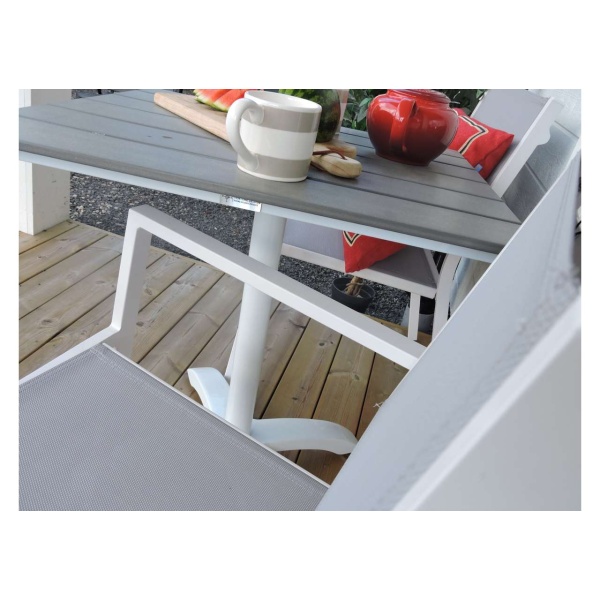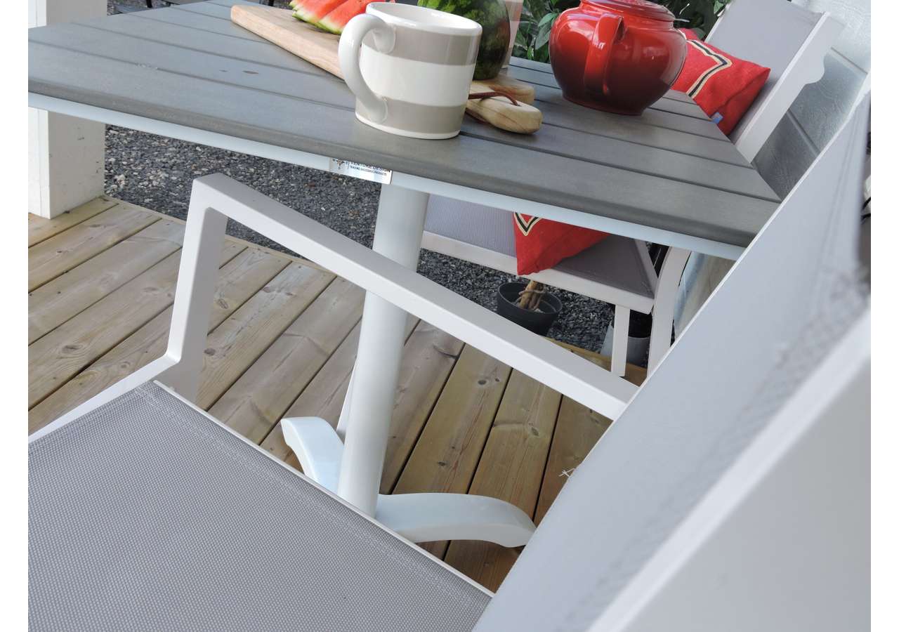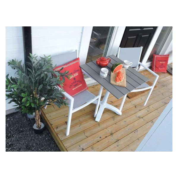 En läckert matchande cafégrupp till uteplatsen! Colorado är ett klassiskt kvadratiskt matbord i nätt design och storlek. Bordsskivan är i grå aintwood och underredet i slitstarkt vitt aluminium, vilket gör att bordet lämpar sig perfekt för utomhusbruk. Här tillsammans med 2st gråa matstolar från serien Copacabana. Stolen är stapelbar för smart förvaring, har en grå sits i textilene och raka ben i vit aluminium. Duka ut fikan och njut av avkopplande stunder! Bordets mått: 70x70cm.