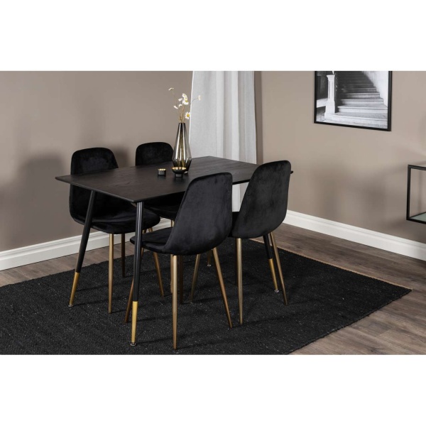 Svart + guld = elegans! Svart matmord med gulddetaljer i serien Dipp tillsammans med pampiga svarta sammetsstolar i serien Polar blir garanterat ett blickfång i rummet.