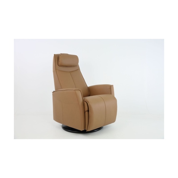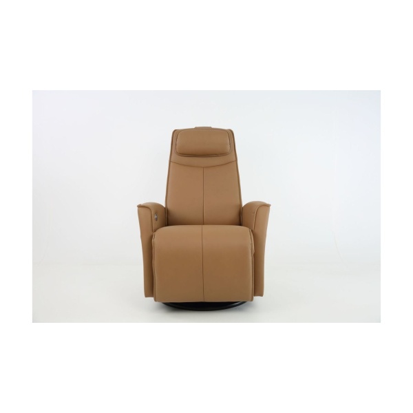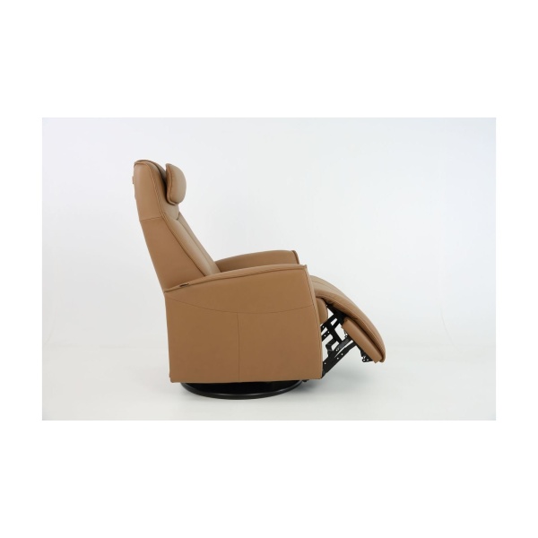 En modern och tidlös recliner fåtölj med brunt läder. Går att justera med eldriven justeringsförmåga, reglerbar nackkudde och rotation och gungfunktion.