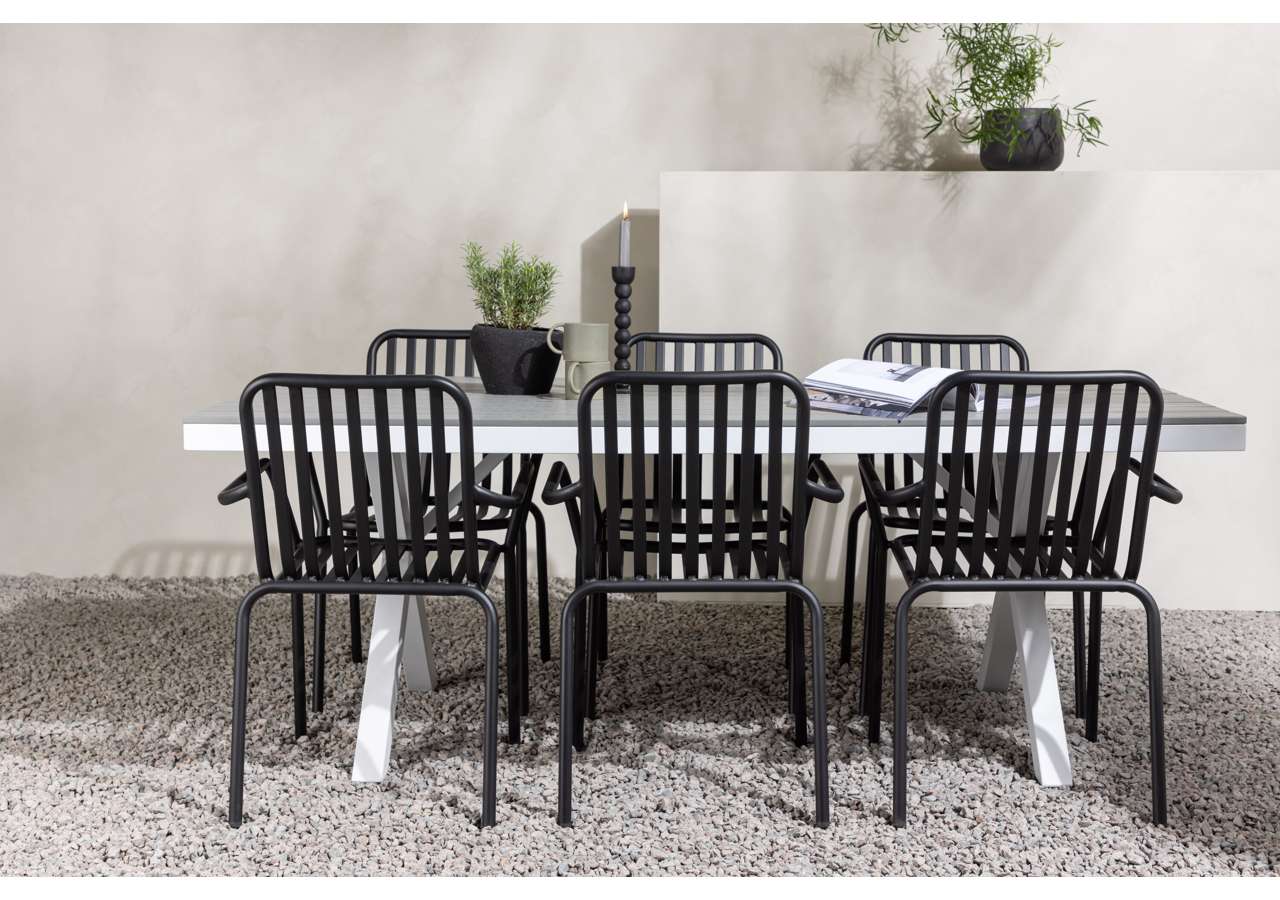 En matgrupp som vänder blickarna till sig! Vårt rektangulära matbord Garcia har en klassisk design med en bordsskiva i smakfull aintwood och kryssade bordsben i vit aluminium. Här tillsammans med våra underbara matstolar från serien Peking. Stolens ribbade utförande och sotiga svarta kulör gör att den både känns modern och tidlös. Tillverkad i aluminium som gör den enkel att flytta runt och integrerade armstöd för extra komfort. Här sitter du kvar länge och njuter på din altan! Bordets mått: 200x100cm.