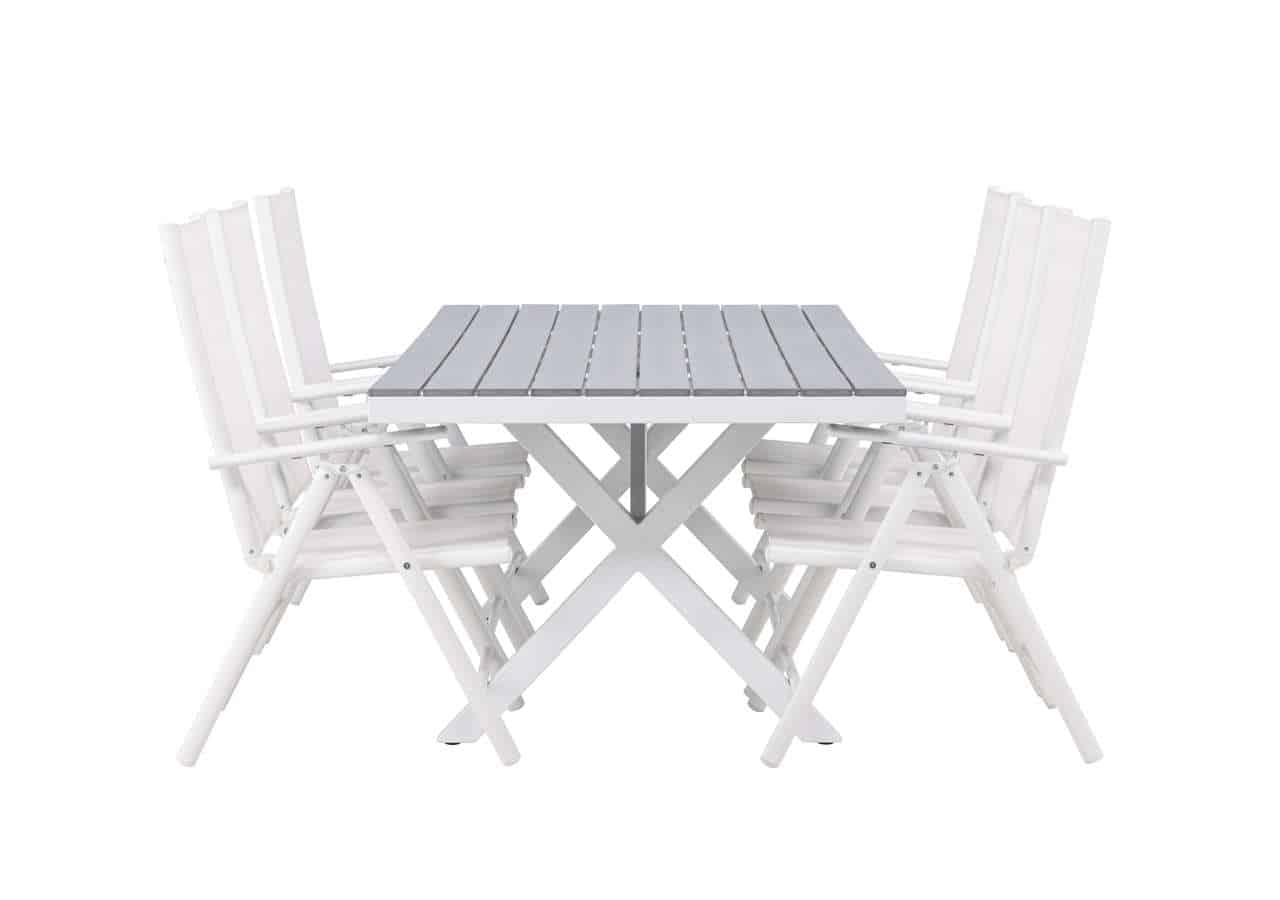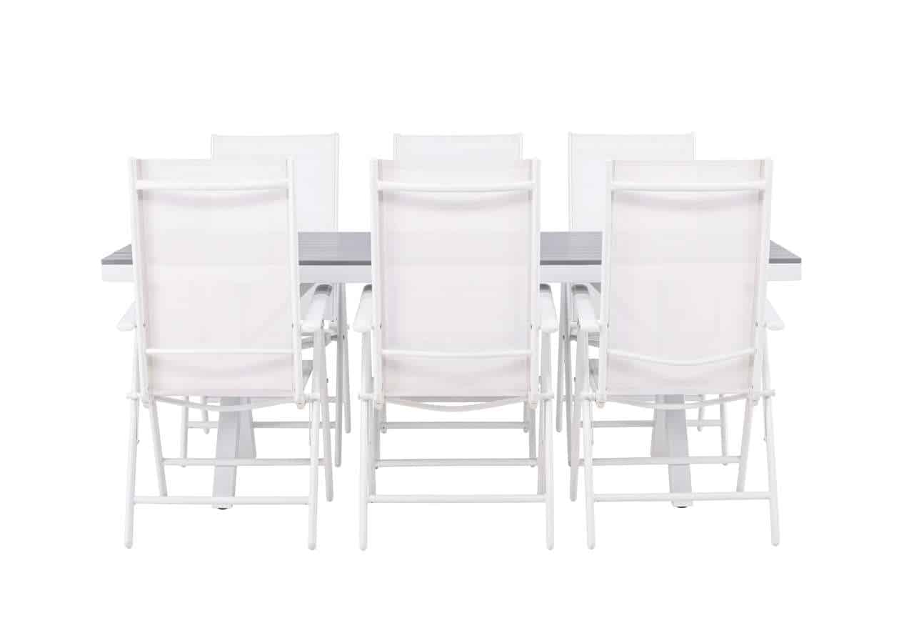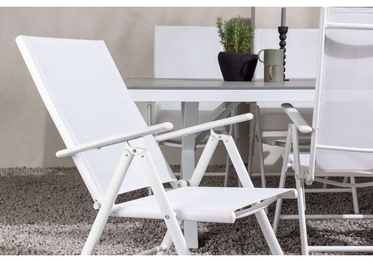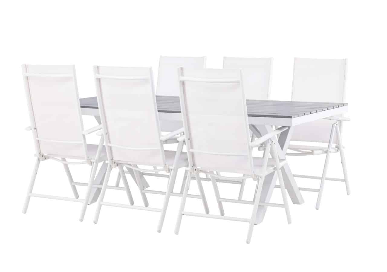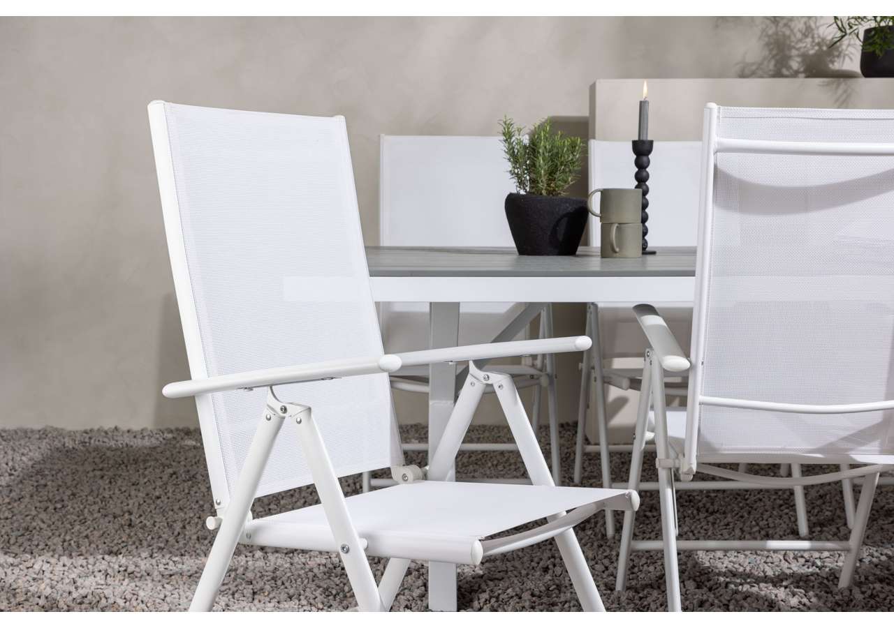Skapa ett ljust och fräscht blickfång på din altan! Vårt rektangulära matbord Garcia har en klassisk design med en bordsskiva i smakfull aintwood och kryssade bordsben i vit aluminium. Här tillsammans med våra fällbara matstolar från samma serie: Break. Stolen har en sits i vit textilene och stolsben i vit aluminium. Den fällbara funktionen ger dig en praktisk stol med hög komfort. Gör dig redo för ett enastående uteliv i sommar! Bordets mått: 200x100cm.