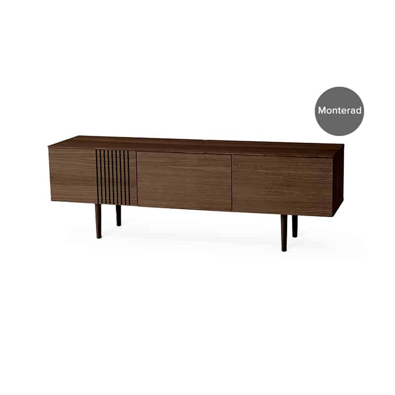 Joel mediabänk B 150 D 39 H 50 cm. Mediabänk i fanerad rökbetsad/lackad ek med tre dörrar och ett trähyllplan bak varje. Svarvade ben medföljer men bänken kan som alternativ monteras på vägg.