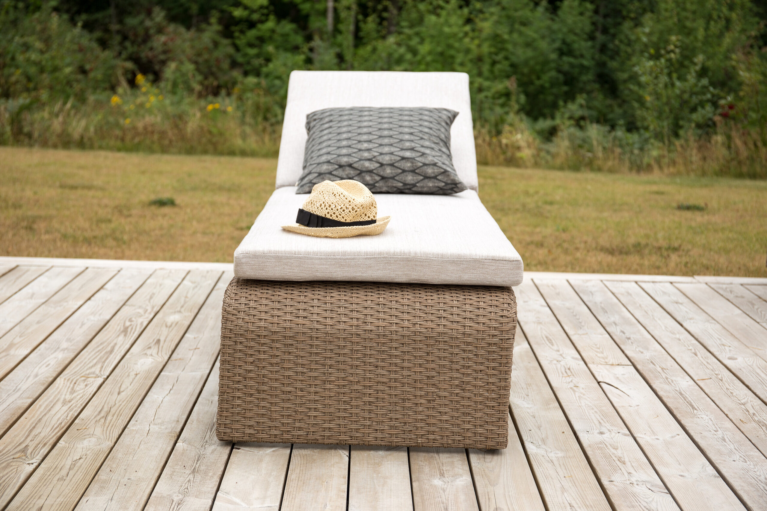 Skapa en lyxig oas på din uteplats i sommar med den här solsängen från serien London! Designen är genomtänk med en stilren look och praktiska funktioner. Här får du naturfärgad solsäng i konstrotting med vit dyna, hjul och justerbart ryggstöd. Välj själv om du vill sitta upp och läsa en bok eller sträcka ut dig i viloposition och njuta av värmen från solen.