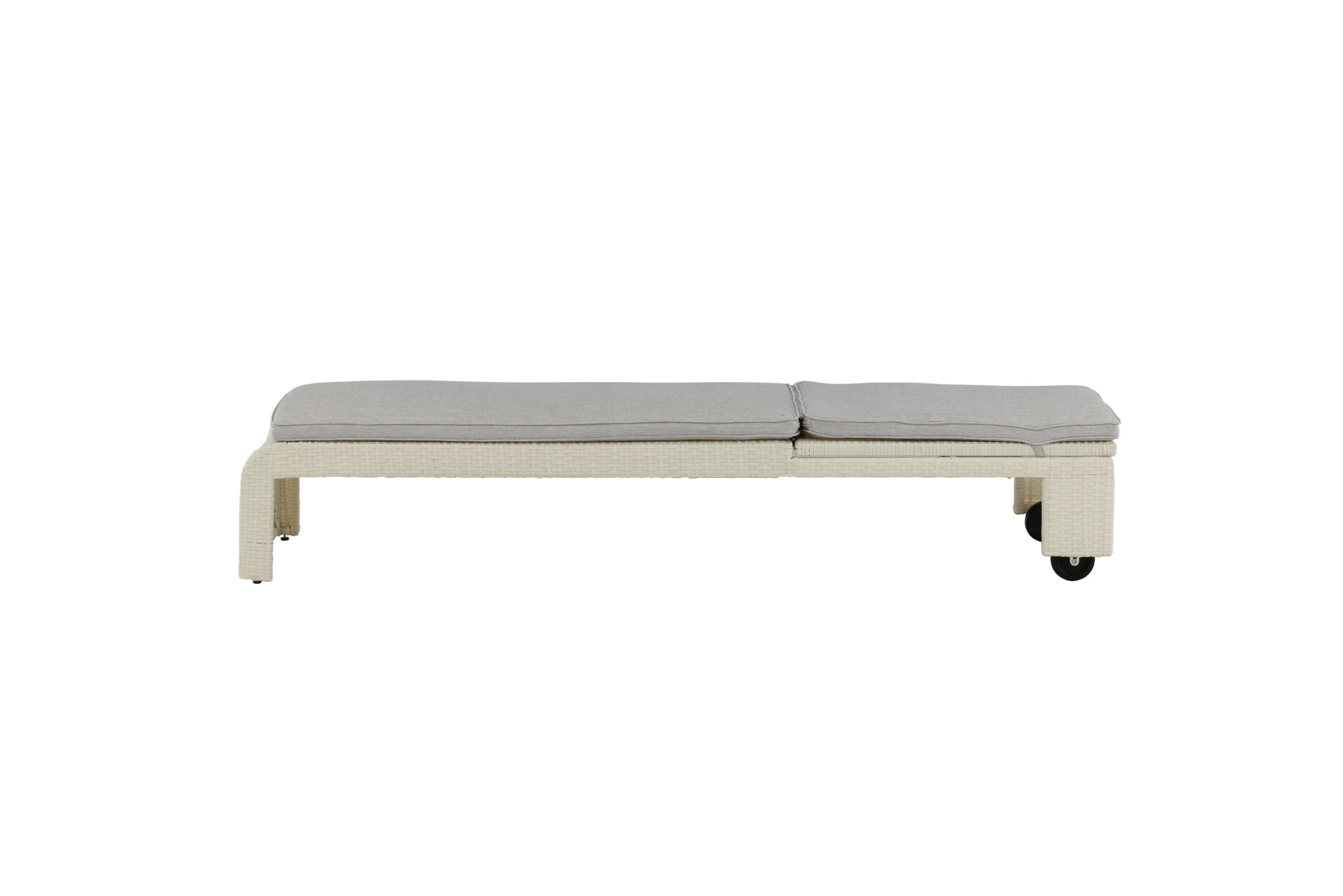 Modern, stilren och pampig solsäng från serien London skapar ett trivsamt blickfång på din uteplats. Här får du en krämvit solsäng med grå dyna, hjul och justerbart ryggstöd för optimala vilopositionen. Solsängen är tillverkad av svart konstrotting vilket gör den slitstark i utomhusmiljö. Här kan du njuta länge av lediga stunder på sommarens soliga dagar!