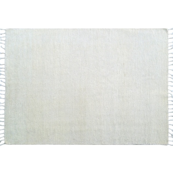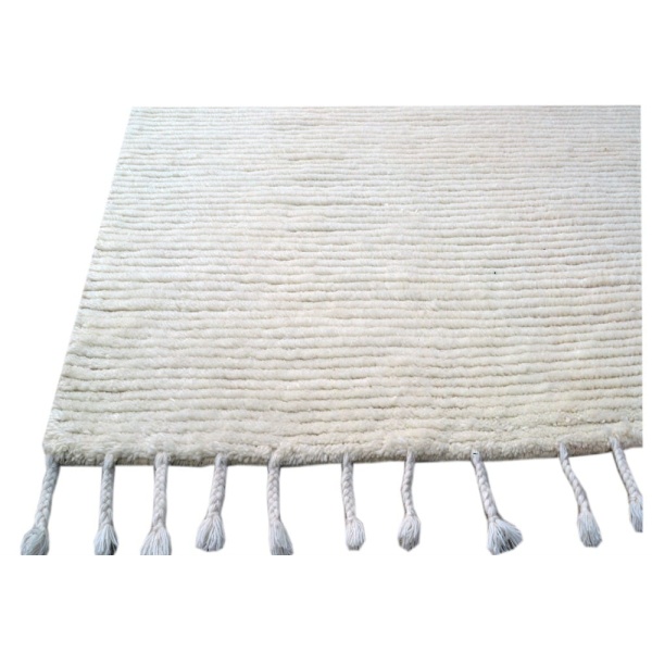 Handknuten och handtuftad ullmatta med tjocka fransar och räfflat mönster i ullen över hela mattan.
