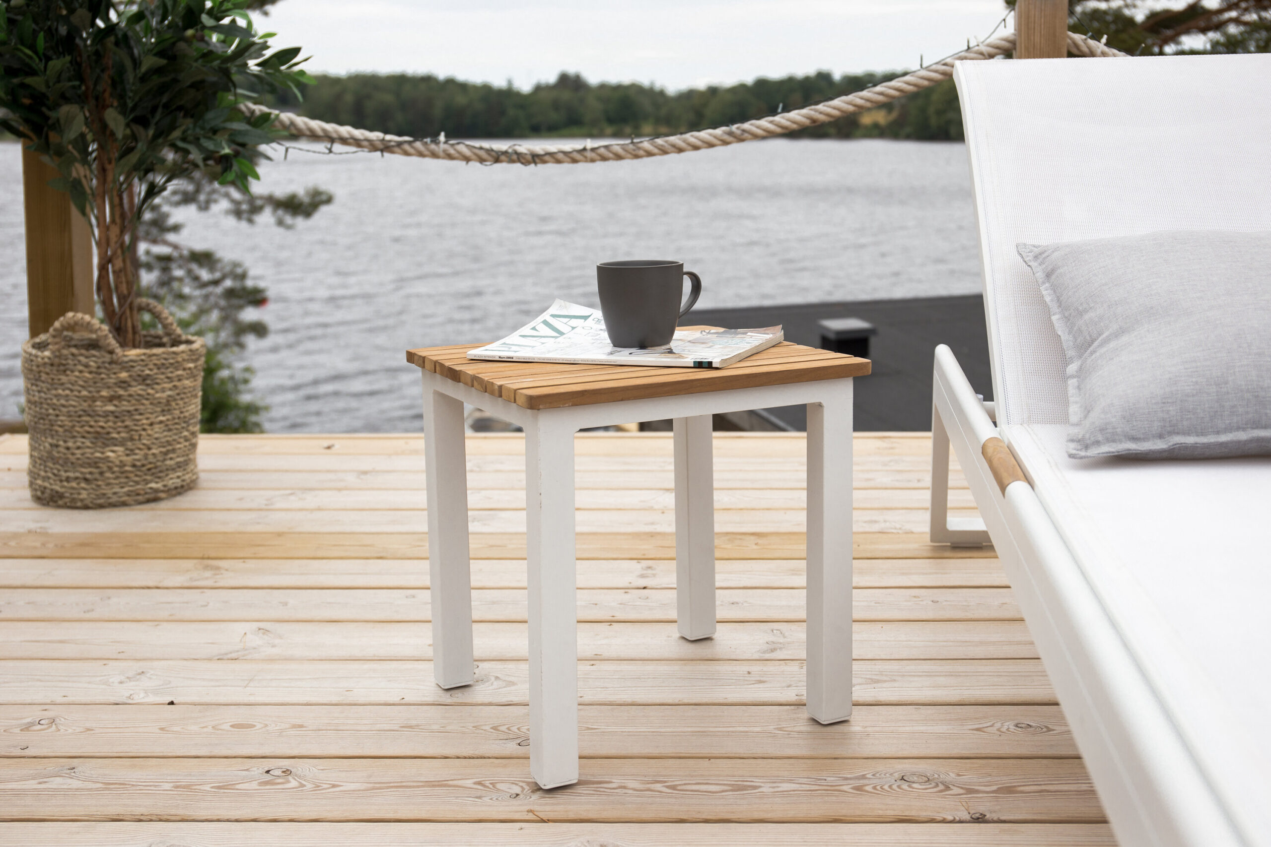 Bordets ben är tillverkade av aluminium i en elegant vit färg, vilket ger stabilitet och en modern touch till din inredning. Bordskivan är tillverkad av teak, som ger en naturlig och varm känsla till bordet.