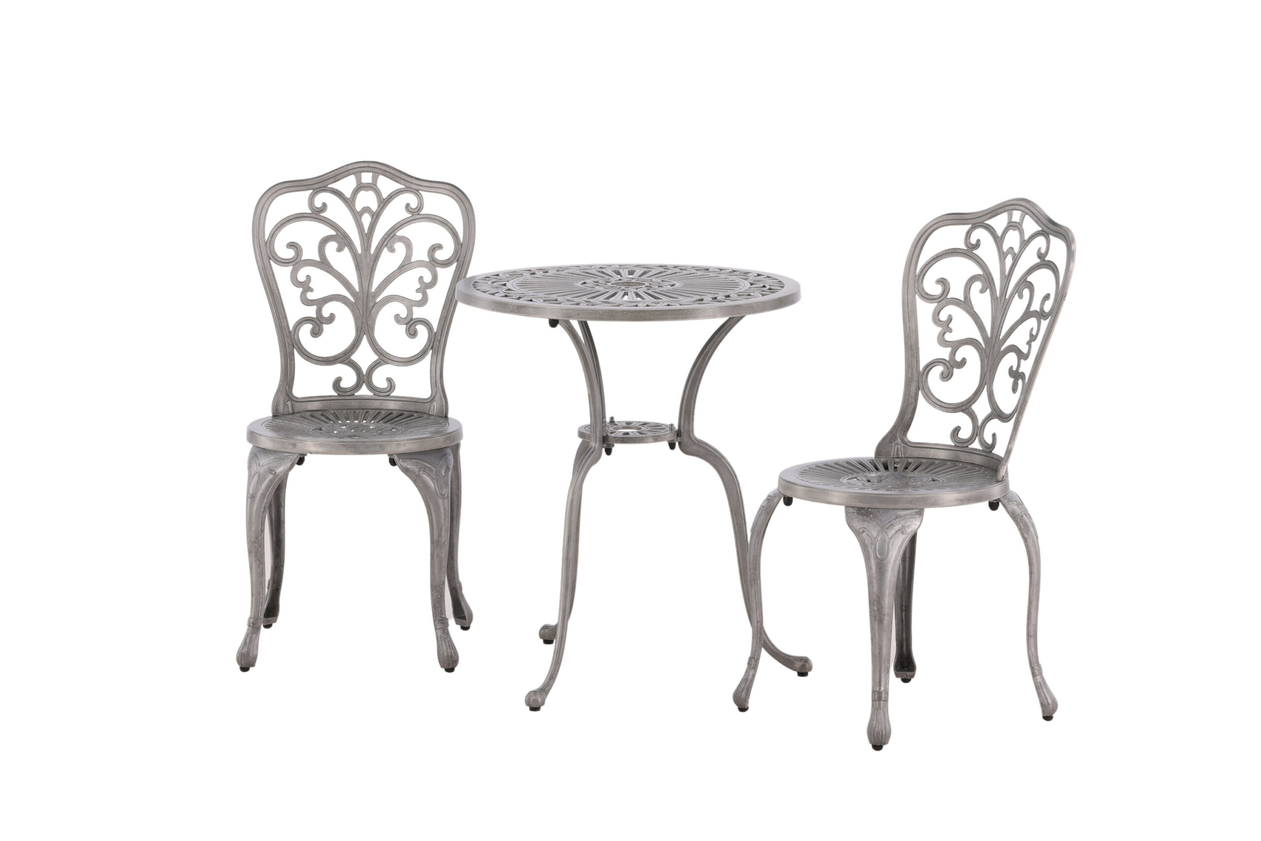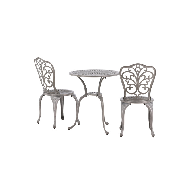 Ett klassiskt cafébord med charmig design och nostalgisk utformning. Det här nätta bordet från serien Nandin har en rund toppskiva som är läckert mönstrad och tre snirkliga ben i aluminium. Duka ut fikan i sommar och njut av lediga stunder ute i solen!