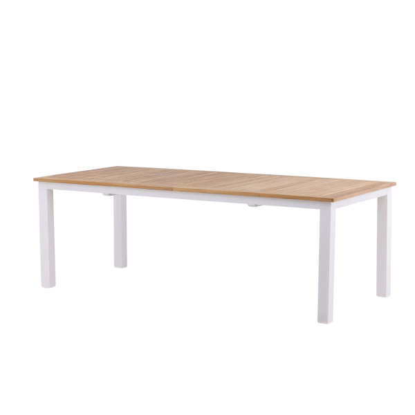 Stilrent, modernt och tidlöst – vad mer kan man önska? Panama är ett förlängningsbart matbord i rektangulär form. Bordsskivan är i vacker teak och underredet i vit metall. Den praktiska storleken gör att bordet fungerar perfekt för både små och stora sällskap så gör dig redo för härliga middagsbjudningar på uteplatsen i sommar!
