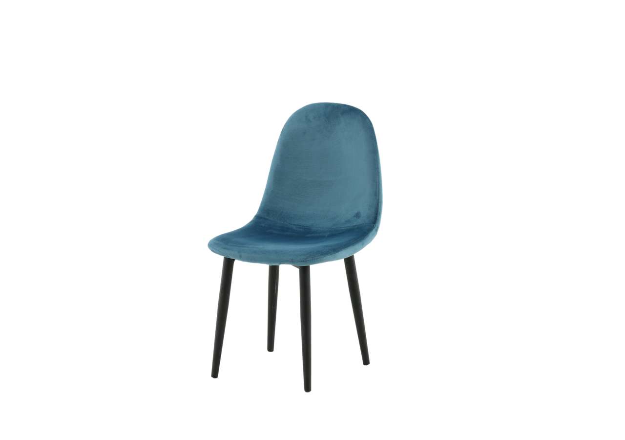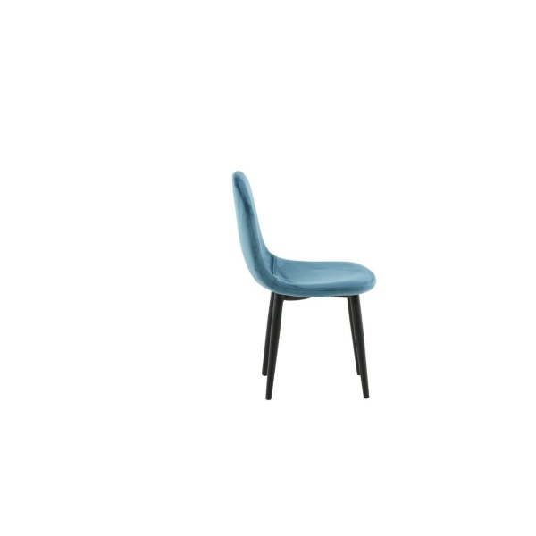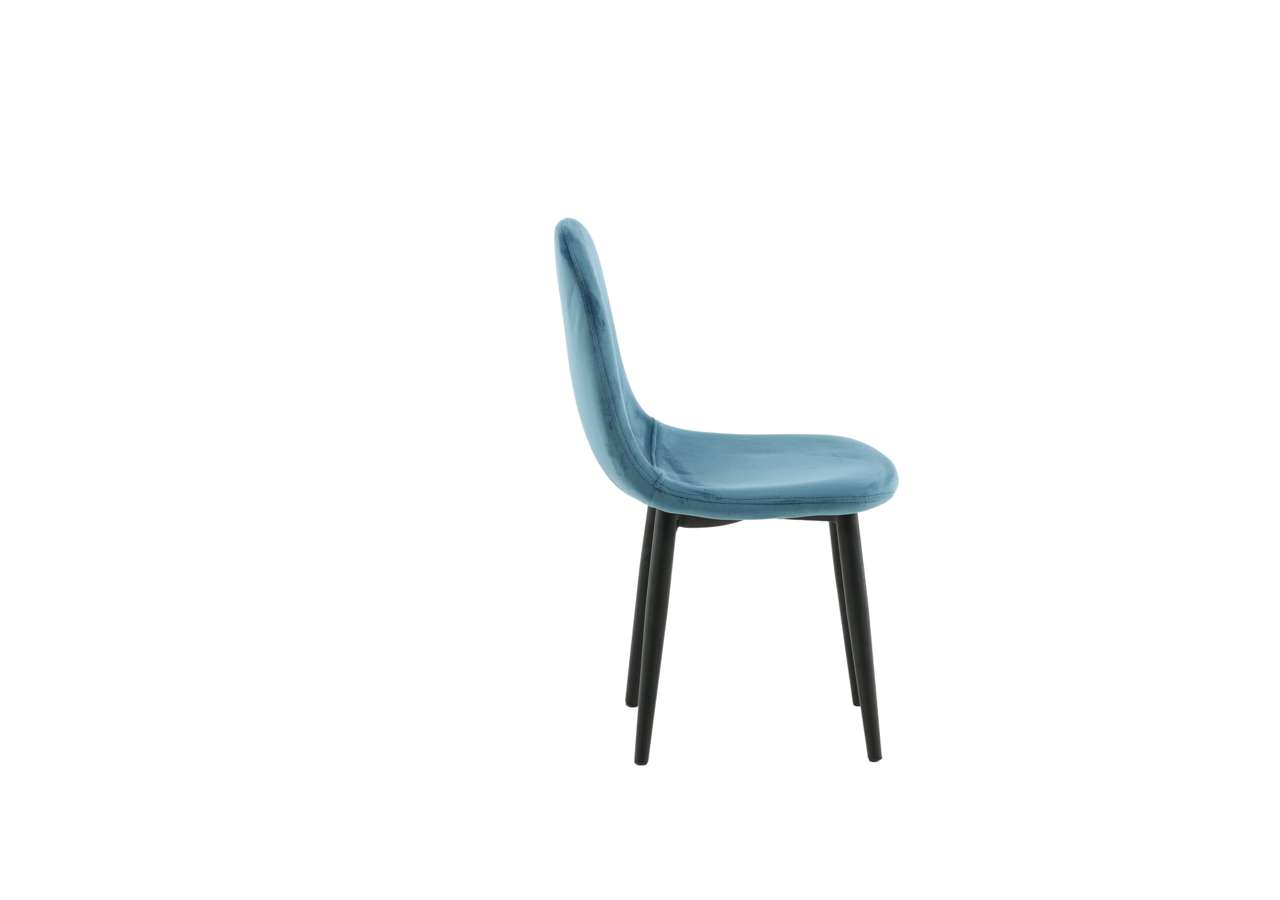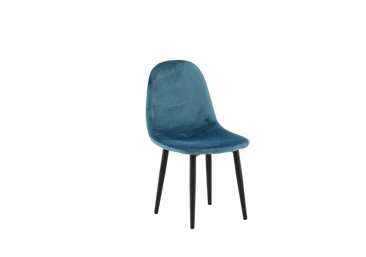Barnstol för barn i en helklädd design med ben i vit pulverlackerad metall samt med en lätt rundad rygg och sits i stoppad blått sammetstyg. Lättare montering krävs.