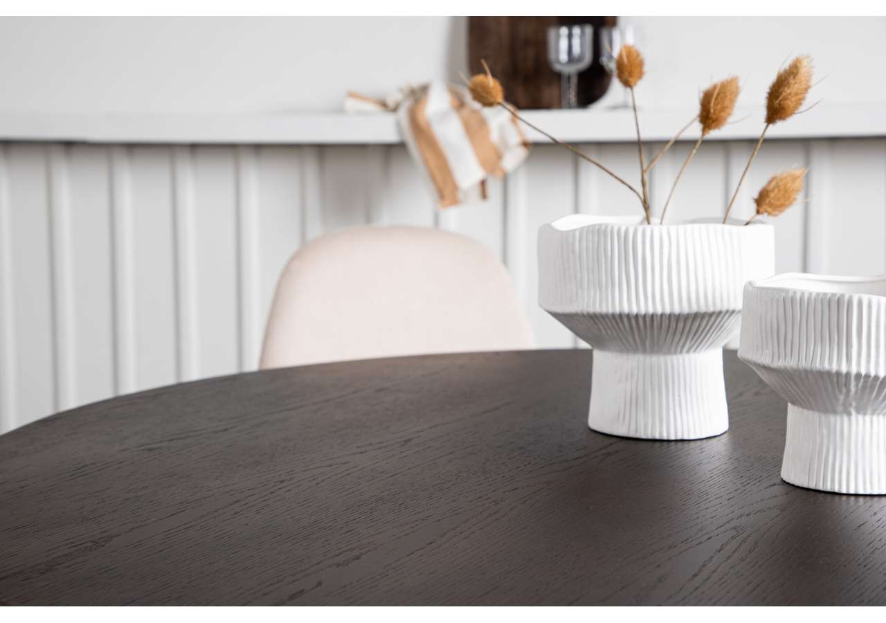 Möblera hemmets hjärta med en matgrupp som utstrålar lyx och komfort! Vårt runda matbord Stone har en läcker Skandinavisk design som faller många i smaken. Bordet har en vacker brunfärgad bordsskiva i MDF med faner och en dekorativ cylinderformad stomme i svart metall. Här i perfekt kombination med matstolar från serien Polar. Stolen har en helklädd design med en rundad rygg och sits i beige sammetstyg med mjuk stoppning och ben i svart pulverlackerad metall. Slipp kompromissa mellan bekvämlighet och snygg design!