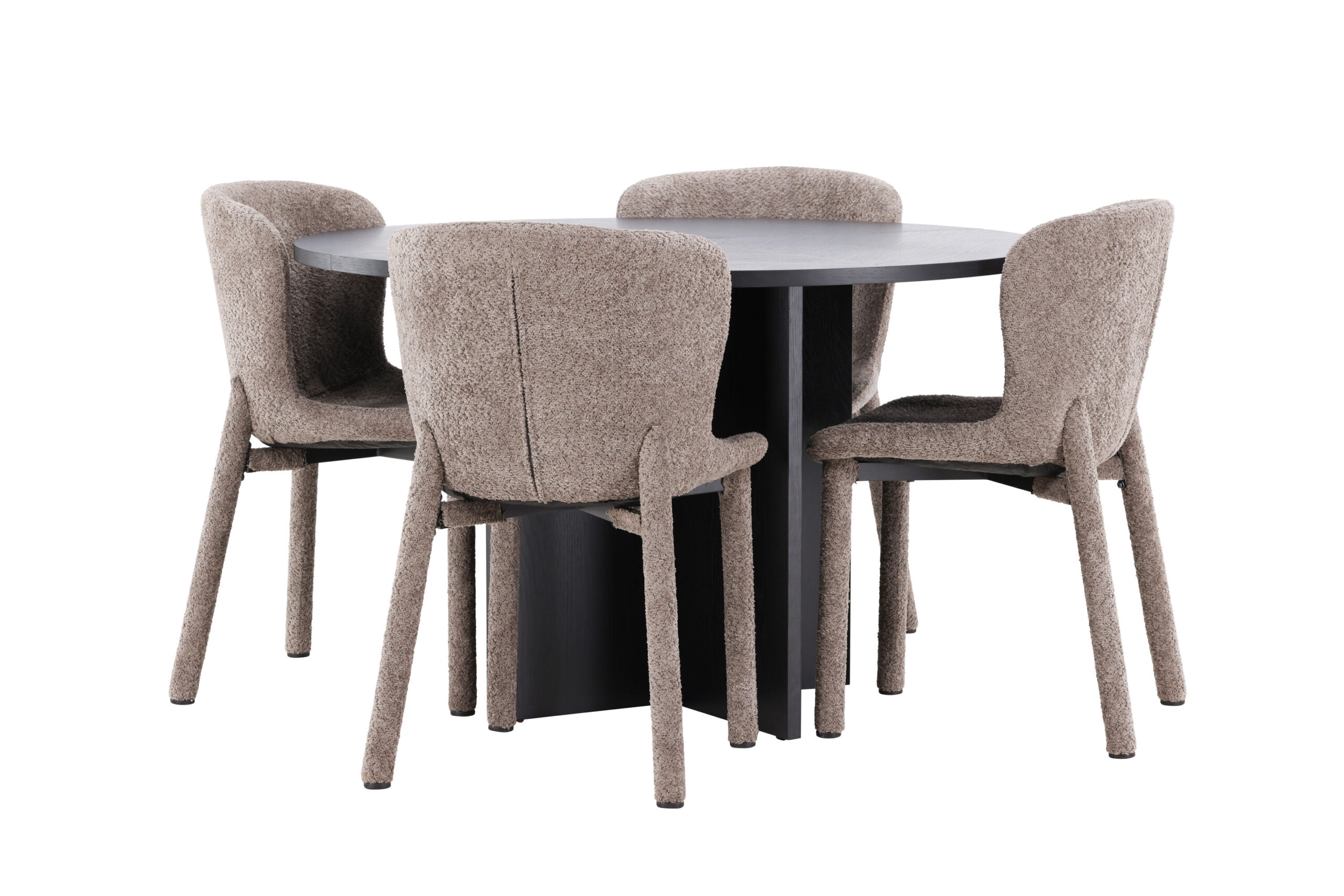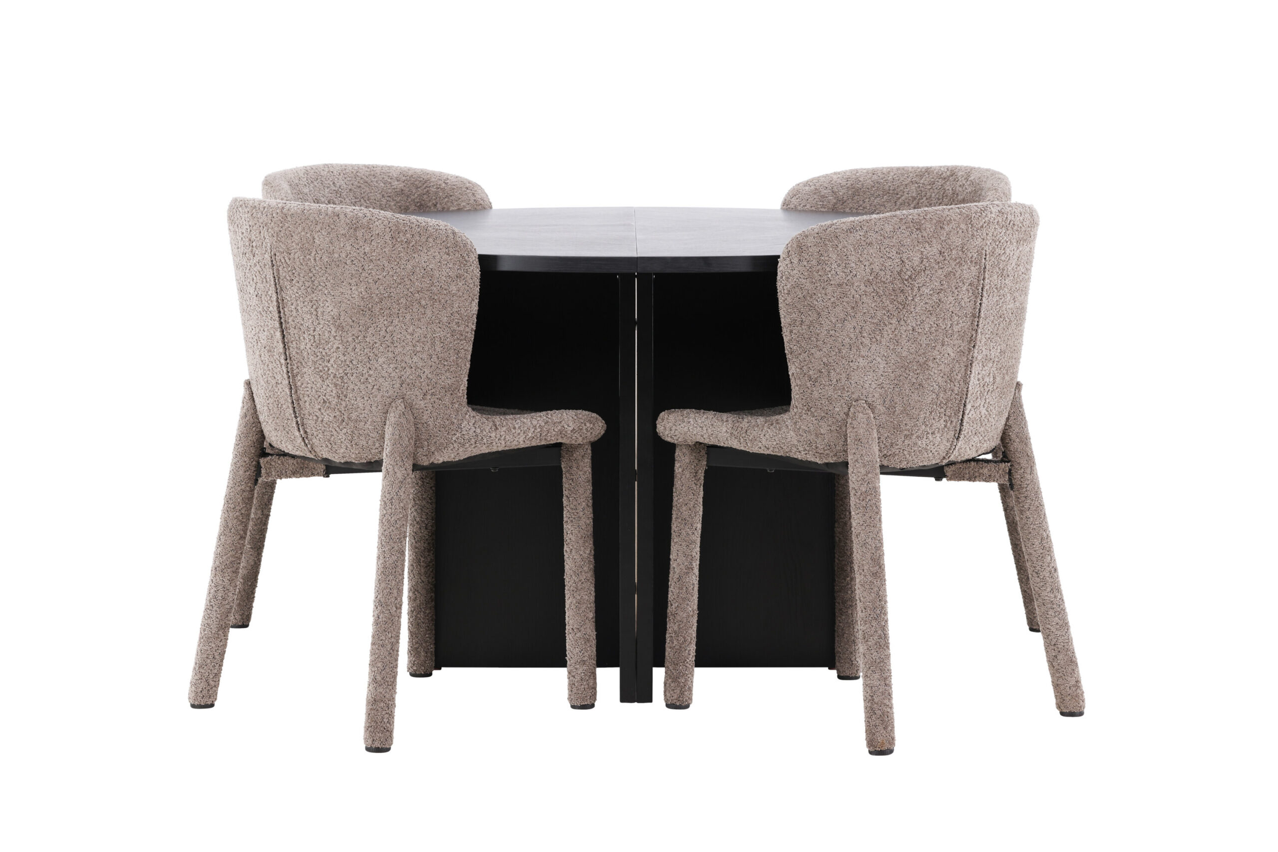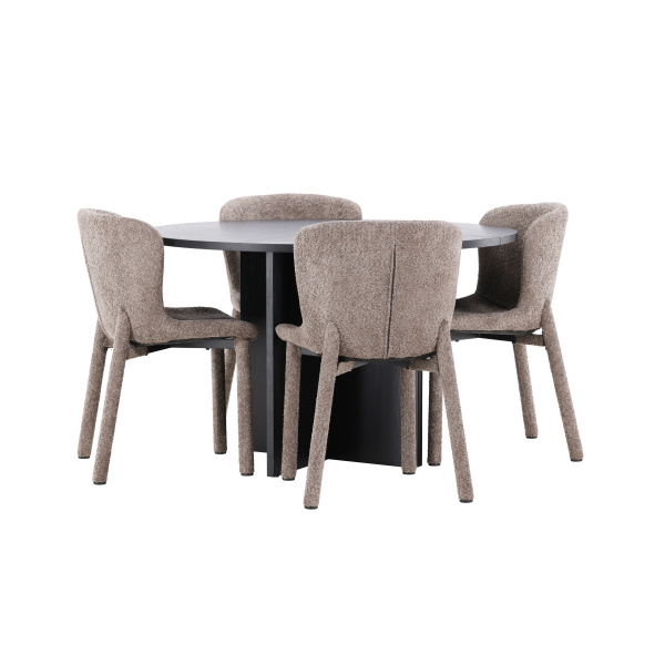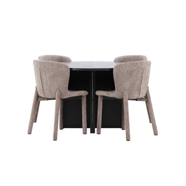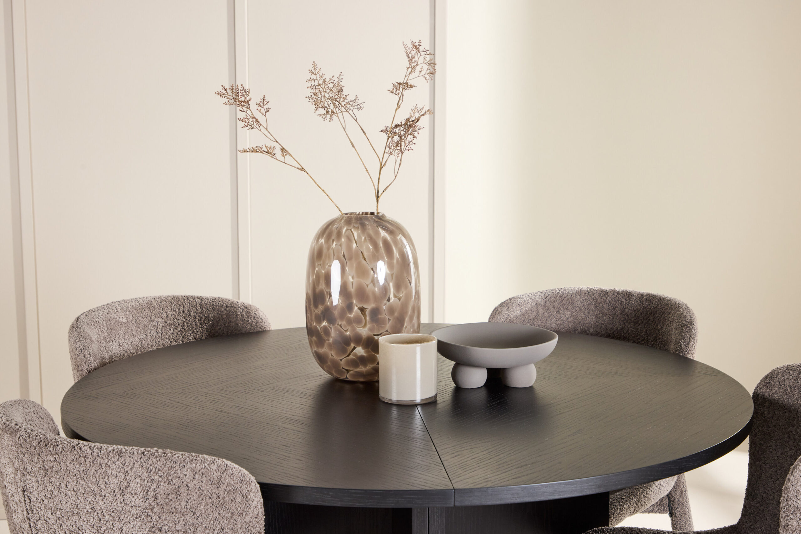 Den svarta fanerträkonstruktionen ger bordet en tidlös och elegant känsla, som smälter in i olika inredningsstilar och skapar en vacker kontrast i rummet. Förlängningsfunktionen är enkel att använda, vilket gör det lätt att anpassa bordet efter dina behov. Tillsammans skapar matstolen Astoria och matbordet Strada en harmonisk och stilfull matplats, där varje måltid blir en lyxig och bekväm upplevelse. Kombinationen av den eleganta bouclén och det stilrena svarta fanerträet förhöjer rummets estetik och ger en tidlös känsla av kvalitet och design.