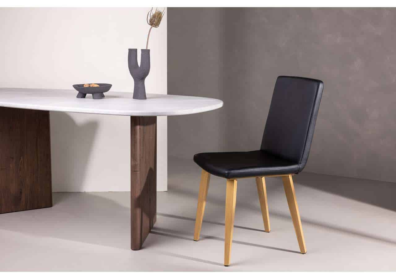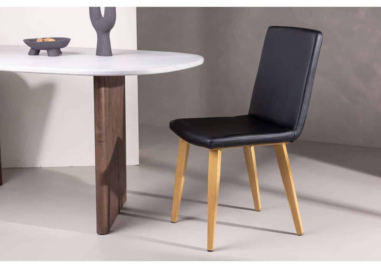 Den klassiska matstolen TODAY har raka nordiska former och en kaxig helklädd sits i svart konstläder. Stolsbenen är lätt utsvängda i naturträ och ger ett stadigt intryck. Den genomtänkta helhetsdesignen är lika modern som tidlös. Matcha med ett snyggt matbord så får du en komplett matgrupp till dina trivsamma måltider framöver!