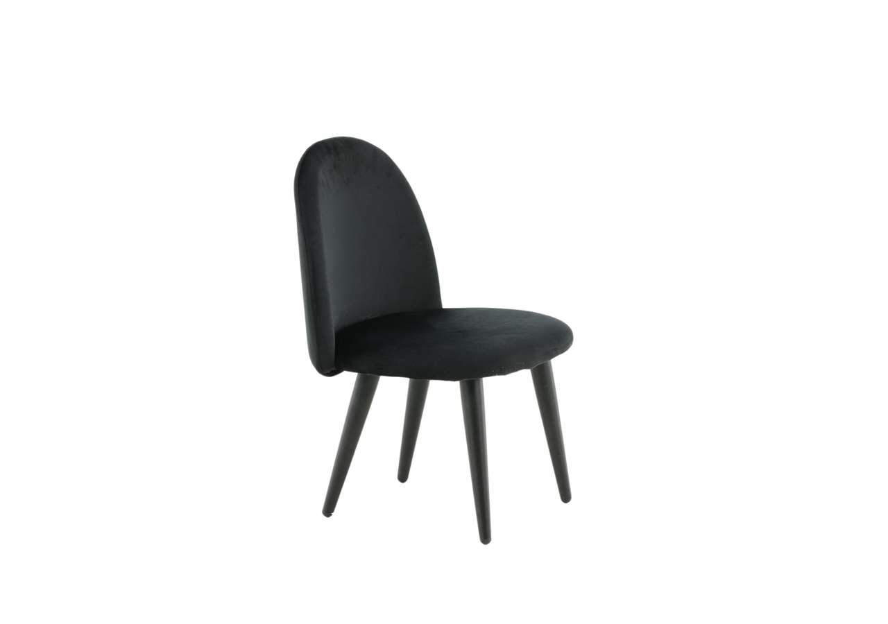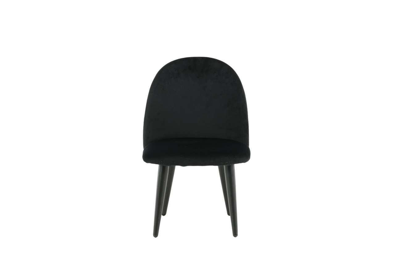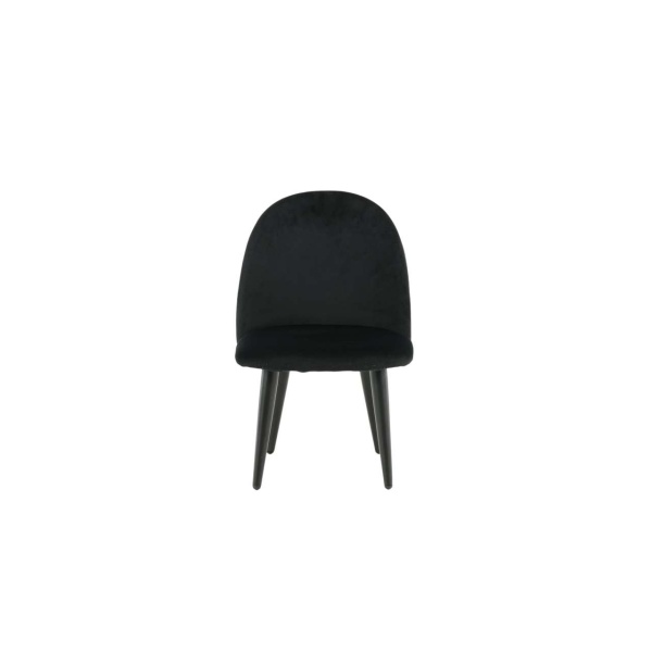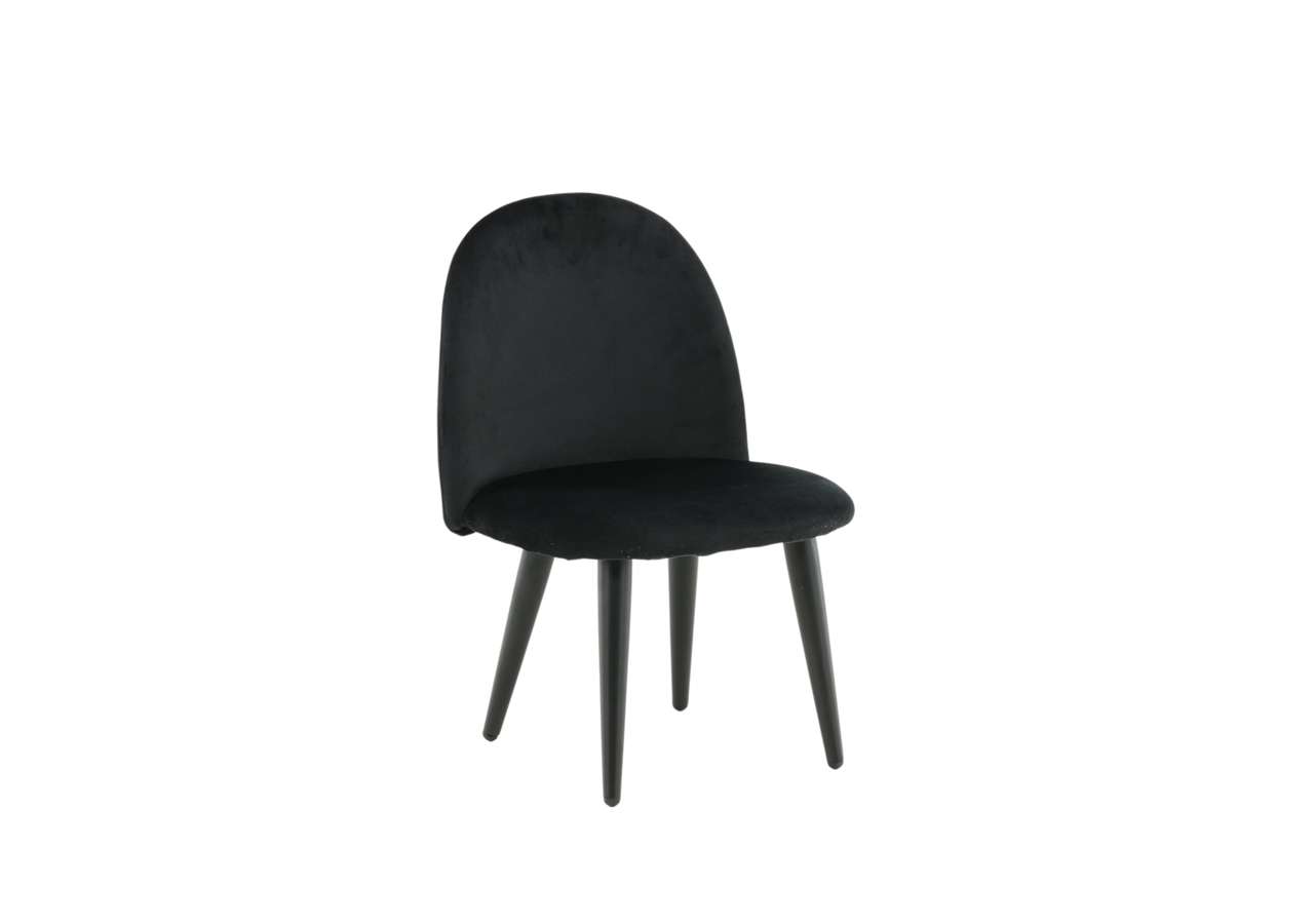 Barnstol för barn i en helklädd design med ben i vit pulverlackerad metall samt med en lätt rundad rygg och sits i stoppad svart sammetstyg. Lättare montering krävs.