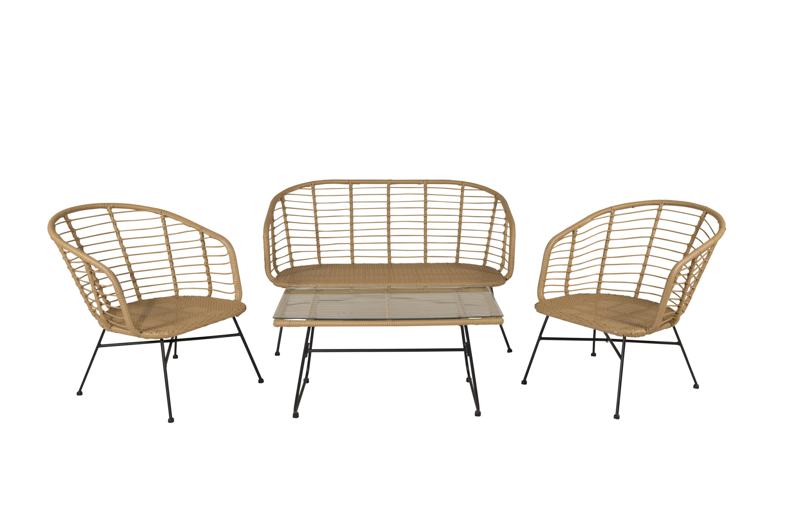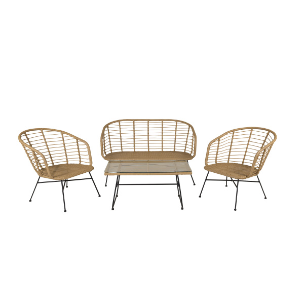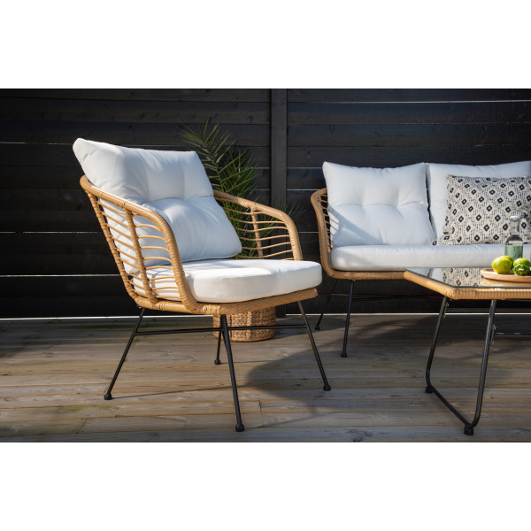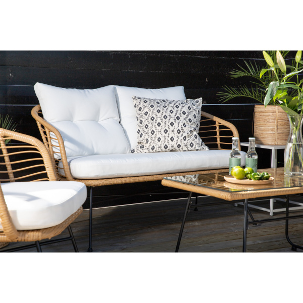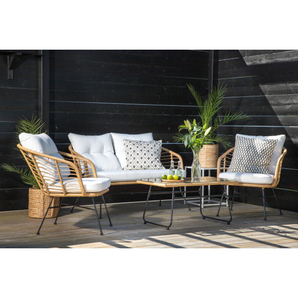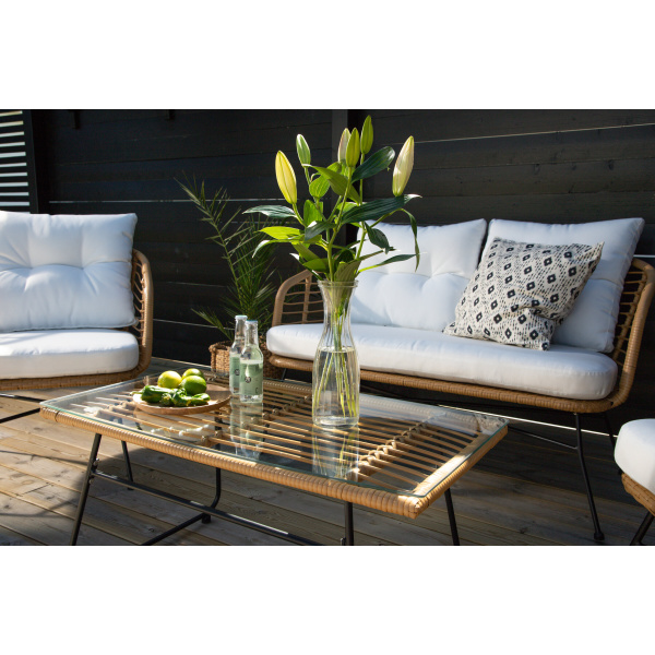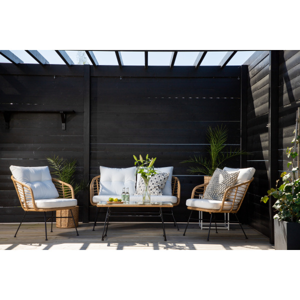 Stilren nätt soffgrupp i modern design som passar perfekt på den inglasade uteplatsen. Möbelgruppen består av en tvåsitssoffa, två karmfåtöljer tillverkat i en nätt ramställning i svart pulverlackerad metall samt rygg och sits är designat i ett stilrent nätt mönster av naturrotting. Inklusive vita dynor och ett soffbord med detaljer i wicker och en bordsskiva av glas. Inred uteplatsen med en lounge-grupp som garanterat kommer förlänga de sena sommarkvällarna tillsammans med nära och kära!