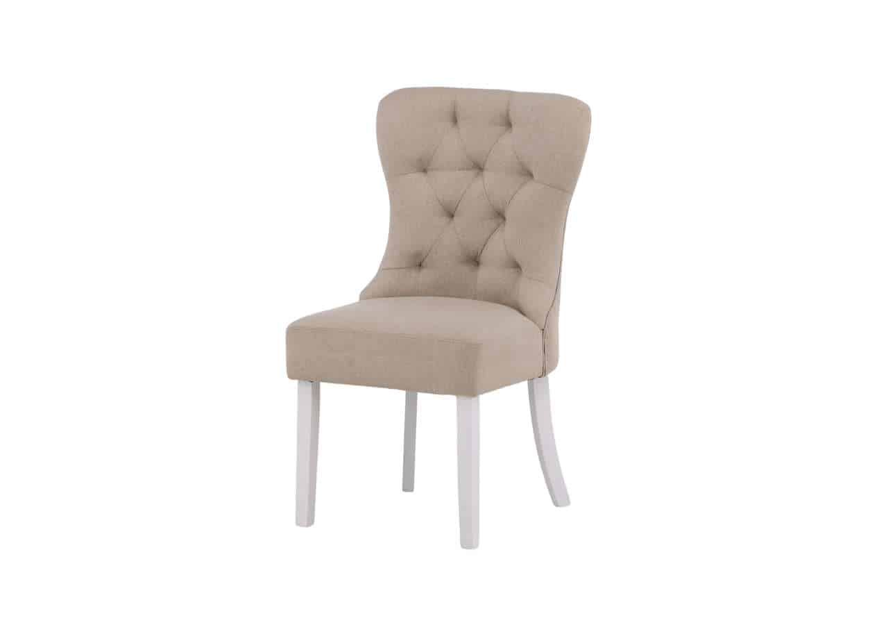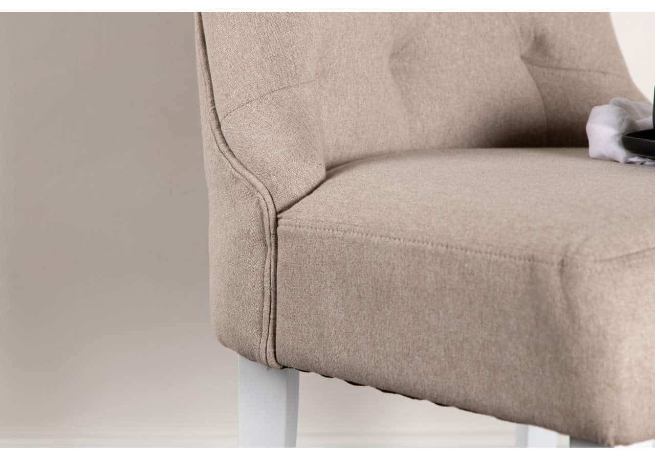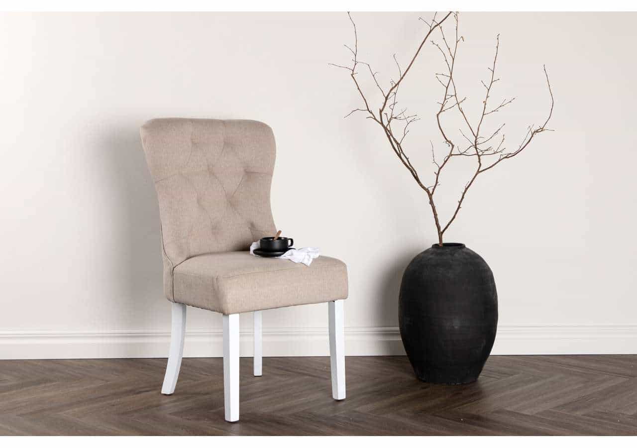 Matstolen från serien Vista är lika bekväm som stilren! Den här matstolen har en pampig, Skandinavisk design med en helklädd sits i beige linnetyg med djuphäftade knappar i ryggen och vita stolsben i trä. Lika slitstark som iögonfallande bjuder den här matstolen in dig till långa, trivsamma stunder kring matbordet. Möblera hemmets hjärta i en ljus och fräsch look!