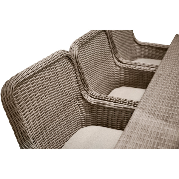 En bekväm matgrupp med alla rätt; slitstark, stilren och praktisk för alla tillfällen! Den här matgruppen från serien Wembley inkluderar ett matbord i konstrotting med en bordsskiva i glas och sex stycken bekväma fåtöljer. Genomgående i en jordnära beige kulör. Möblera uterummet eller trädgården inbjudande och bekvämt i sommar!